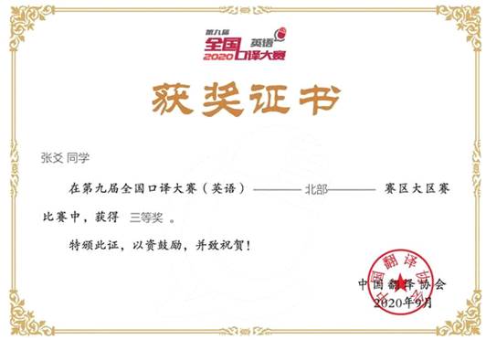 29 и 30 августа посредством онлайн-конкурса был проведен 9-й Национальный конкурс устного перевода (английский язык) региональный конкурс. После предварительного отбора и обучения наш университет направил в общей сложности 6 студентов от имени Шаньдунского района для участия в конкурсе. После ожесточенной конкуренции наш студент Чжан Яо по специальности английского языка и аспирант по письменному переводу Лю Хаодун получил третью премию, студенты Ван Янь,Чжао Хуань, Ма Шуан, Дэн Юянь по специальности английского языка получили награду за выдающиеся достижения. Инструктор на факулитете английского языка и литературы Ли Яньюнь и Чжу Шань завоевали звание отличных инструкторов.