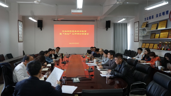 3月30日,文法学院召开党史学习教育部署会,同时进行了“双创”工作研讨布置,学院党委书记姚成郡、副书记陈熙、教工党支部书记和委员、团委书记、学生党支部书记参加会议。
