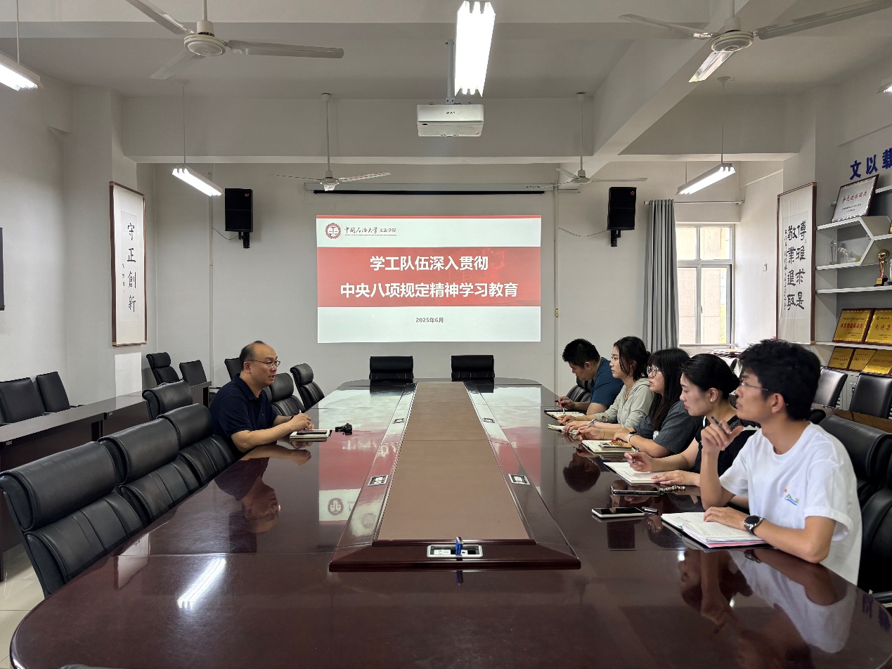 会上,陈熙系统阐述了中央八项规定精神的核心要义与价值要求,立足辅导员队伍作风建设,以丰富翔实的典型案例,围绕作风建设、纪律意识、能力素养和自我约束等方面进行深度剖析。他强调,作风建设不是“一阵风”,而是融入日常的“终身课”,辅导员作为学生成长路上的“关键引路人”,必须拧紧思想“总开关”,时刻保持“慎微慎初”的清醒,主动对标对表,刀刃向内查摆问题,以高度的政治自觉和行动自觉贯彻落实中央八项规定精神,营造风清气正、向善向上的育人生态。团委书记赵延升表示,作为辅导员要时刻牢记中央八项规定精神的要求,在日常工作中注重廉洁自律,杜绝任何形式的违规违纪行为,同时要以身作则,引导学生树立正确的价值观和道德观。