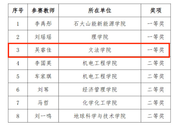 为进一步提升青年教师的教学能力,促进青年教师间的学习、交流和快速成长,学校组织开展了2024-2025学年新进青年教师试讲比赛。经过小组赛和学校决赛两个环节,确定一等奖3名、二等奖5名,我院吴睿佳博士获得学校决赛一等奖。
