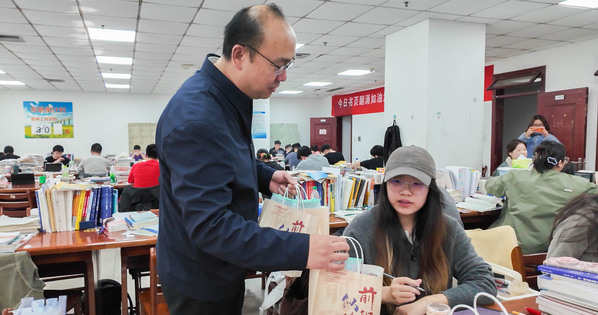 活动当天,活动现场气氛温馨。冷凌走进学生中间,与学生们亲切交流,围绕高效刷题、错题整理、考前心态调整等备考核心问题,结合学科案例进行细致讲解,语言严谨、方法实用,为同学们提供了具有针对性的复习指导;陈熙亲切询问学生们的复习进展与身心状态,及备考中遇到的实际困难,耐心倾听学生们在知识点梳理、时间规划、心理调节等方面的困惑与诉求,全程专注倾听并给予鼓励与慰藉;杨倩则聚焦考研冲刺阶段的关键节点,向学子们明确强调作息规律、饮食健康对备考效率的重要性,劝勉学生们在高强度复习中坚守身体底线,杜绝熬夜透支、饮食不规律等情况。随后,学院师生志愿者一同将暖心礼包送到学生手中,现场暖意融融。一份份礼物,既包含定制文具、透明收纳袋、暖贴等实用物品,也有补充能量的零食。此外,每一份礼包中都包含了一张由教师亲笔写下的祝福卡片。这些礼物承载的不仅是实用的物资,更是全院师生对考研学子的深切关怀与信任。收到礼包的学生们纷纷表示,这份突如其来的温暖缓解了备考压力,让他们感受到自己并非孤军奋战。