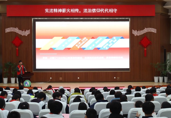 本次宣讲以“宪法宣讲与启蒙”为核心目标,精心设置初识宪法、再识宪法、回望宪法三大板块,在系统普及法律知识的同时,切实强化宪法宣传实效。在“初识宪法”环节,宣讲人结合历史时间线为学生们梳理了宪法发展脉络,明确我国国家宪法日设立时间及背景,同时着重点明宪法作为国家根本大法的最高法律地位,这一基础科普是宪法启蒙教育的关键一步,为同学们的宪法认知构筑了坚实框架。“再识宪法”板块聚焦宪法结构与公民基本权利。宣讲人简要介绍了宪法的整体架构,并运用通俗语言和贴近生活的案例,重点解读了人身自由、受教育权等与青少年成长密切相关的核心权利与义务,帮助学生明晰权利与义务的边界,助推法治观念的萌芽;“回望宪法”环节中,宣讲人详细介绍宪法宣誓制度的出台背景与核心意义,并组织学生观看宪法宣誓仪式视频,让学生直观感受宪法的庄严与权威,进一步提升宪法宣传的感染力,强化学生们对宪法的内心认同与尊崇。