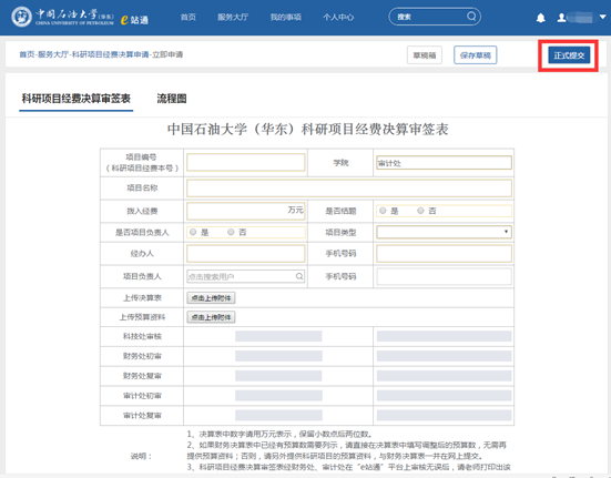 4、填写科研项目经费决算审签表,确认无误后点击【正式提交】