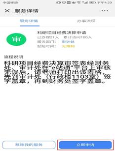 3、点击【立即申请】,填写科研项目经费决算审签表,确认无误后点击【正式提交】。