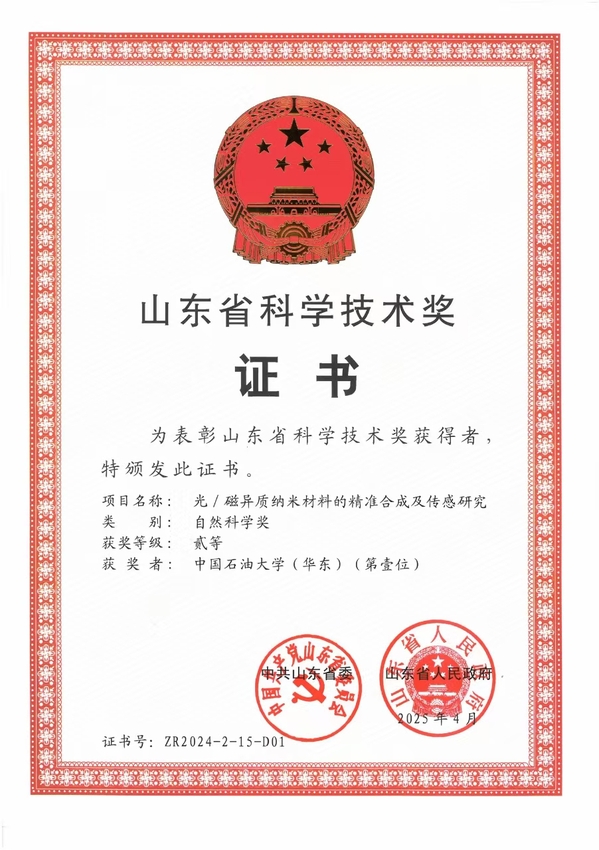 由曾景斌、温聪颖、荣铭聪、陈曦、阎子峰完成的“光/磁异质纳米材料的精准合成及传感研究”项目获得山东省自然科学奖二等奖。该项目提出了磁性富集-光学检测耦合新机制,建立了g-C₃N₄量子点爆炸物荧光识别原理,发现了晶格失配外延生长规律,成功开发出多类具有超高灵敏度、精准识别能力的光磁异质纳米探针。目前,该类材料已在重大疫情防控、化工安全监测、反恐防爆检测等领域实现重要应用。项目5篇代表性论文他引817次(单篇最高他引302次),3篇论文入选ESI高被引/热点论文;获国家发明专利授权5项,应邀在《Coordin. Chem. Rev.》《Nano Today》等权威期刊发表综述3篇(ESI高被引1篇),在国际学术会议作特邀报告4次。核心成果被选为《Advanced Functional Materials》封面论文,被《Chemical Reviews》、《Chemical Society Reviews》等顶级期刊大篇幅评述,列为多模态传感领域的标志性进展。