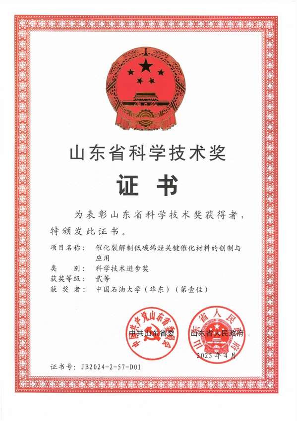 由陈小博、闫昊、张强、王耀伟、刘熠斌、史会兵、王婷、张金庆、 李春义、杨朝合共同完成的“催化裂解制低碳烯烃关键催化材料的创制与应用”获得山东省科技进步二等奖,该项目针对重油催化裂解制烯烃过程所面临的低碳烯烃收率低、甲烷和焦炭收率高等关键技术难题,提出了“烃类裂解过程定向调控”的研究策略,建立了活性位与烃类裂化性能关系的机理预测模型,创新了工业催化裂解催化剂的活性结构,成功开发出适应于不同石油馏分催化裂解制低碳烯烃的催化剂及配套工艺。相关研究成果已在青岛惠城、京博石化等10 余家企业推广使用,经济社会效益显著。获授权美国发明专利 1 项,中国发明专利 20 项,发表论文 87 篇,培养青年人才、博士及硕士研究生 60余人。该技术有利于促进重油资源的高效利用,可推动山东省炼化产业转型升级,对实现经济与环境的和谐发展具有重要意义。