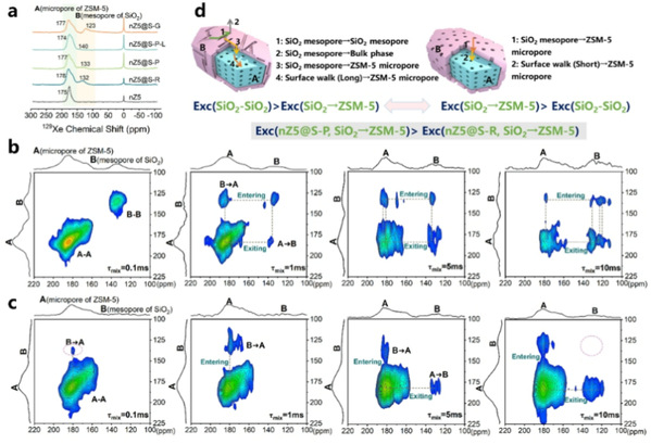 为此,阎子峰教授团队构建了以ZSM-5为沸石组元,以介孔二氧化硅(SiO₂)为非沸石组元,且组元间孔道匹配联通性精准可控的一系列催化裂解模型催化剂,系统地研究了工业催化剂中沸石和非沸石组元界面间的孔道匹配联通性与扩散-反应动力学之间的构效关系,以更好地确保反应中间产物在两者之间更好地扩散和迁移。团队运用跨尺度研究方法,采用超极化129Xe(HP129Xe)和二维交换光谱NMR(2D EXSY NMR)证实了沸石组分(ZSM-5)和非沸石组分(meso-SiO2)之间独特的孔道连通性和扩散行为,并通过智能重量分析(IGA)和时间分辨原位傅里叶变换红外光谱(time-resolved in situ FTIR)研究了模型多组元催化剂的整体扩散和沸石部分扩散行为。
