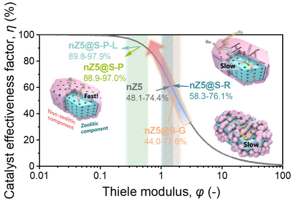 沸石分子筛基催化剂作为重要的工业催化剂,广泛应用于石油化工、煤化工、环境保护等领域。其通常由“沸石组元”(如ZSM-5分子筛)和“非沸石组元”(如二氧化硅、氧化铝、无定形铝硅酸盐、粘土等)共同构成。在聚烯烃催化裂解、重油催化裂化等大分子裂解反应中,这两类组元通过协同作用共同决定了催化剂的扩散与反应性能。然而,目前大多数研究工作主要集中在单一沸石或非沸石组元的扩散行为研究上,对于沸石组元与非沸石组元间的裂解中间产物扩散迁移及其与裂解反应性能的关系研究鲜有报道。