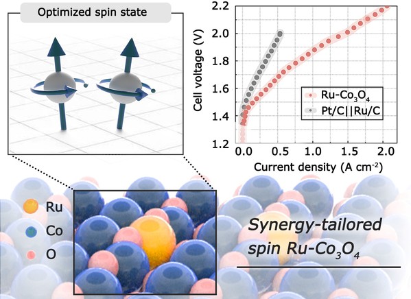 电解水制氢是实现碳中和的关键技术,其核心为析氧反应(OER)和析氢反应(HER)。这两种反应均依赖羟基中间体(OH*)的吸附行为,该行为直接影响电催化剂的活性与稳定性,进而决定水分解效率。在以(氢)氧化物为载体的钌单原子催化剂中,精准调控载体自旋态对优化OH*吸附、提升水分解效率至关重要。然而,在低钌负载条件下,传统调控策略难以有效调节载体自旋态,限制了水分解反应的整体性能。为突破这一瓶颈,研究团队提出了一种创新性的解决方案。通过强原子和电子协同作用,设计并合成了一种新型的单原子钌掺杂Co3O4催化剂(a-Ru-Co3O4)。该催化剂富含高自旋Co3+物种,这些高自旋Co3+不仅作为强OH吸附位点,显著促进了水分子的解离,还增强了向钌位点供应H中间体的能力,从而加速了HER反应的Volmer–Tafel路径。此外,高自旋Co3+还有助于形成和稳定O*–Ru–O–Co–OH*中间体,为OER反应提供了一种动力学更为有利的氧化路径机制。因此,a-Ru-Co3O4表现出优异的双功能催化活性,其质量和成本归一化性能分别比商业Ru/C高出约30倍。当集成到阴离子交换膜电解槽中时,a-Ru-Co3O4在2.0 V槽电压下实现了1.46 A cm⁻2的工业级电流密度,并展现出卓越的耐久性。