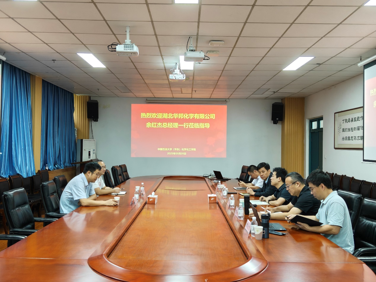 9月26日上午,湖北华邦化学有限公司总经理在武汉校友会秘书长向军的陪同下到访,就校企合作、成果转化、人才引进开展交流。本次会议由化学化工学院副院长胡涵主持,党委副书记徐光辉、重质油全国重点实验室副主任柴永明教授、邓文安教授、覃正兴副教授等共同参会。
