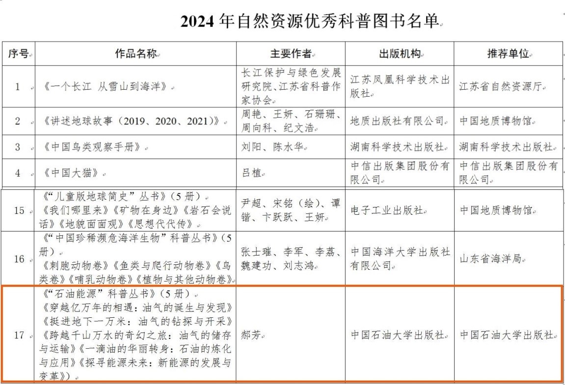 5月29日,自然资源部在山东济宁组织举办“2024年自然资源科技活动周主场活动”,活动现场公布了“2024年自然资源优秀科普图书”名单,校长、深层油气全国重点实验室主任郝芳院士主编的《石油能源科普丛书》入选。