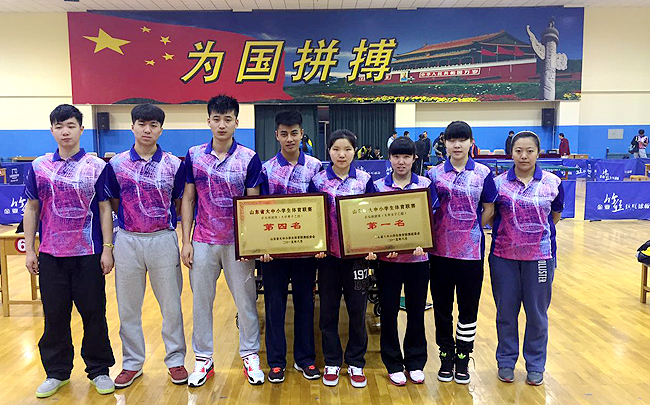 11月18~21日,2015年山东省大学生乒乓球锦标赛在潍坊举行。我校乒乓球队参加男子乙组、女子乙组两个组别的比赛,取得团体总分第二名的好成绩,其中女子团体首次获得冠军,男子团体获得第四名。陈晓钰、王天怡、李莹包揽女子单打前三名;王川、李莹获得混合双打冠军;李莹、陈晓钰获得女子双打季军。教练员高千里、运动员王天怡获得体育道德风尚奖。