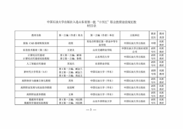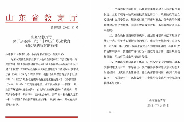据悉,本次评选是深入贯彻全国教材工作会议和全国职业教育大会精神,落实教育部《关于组织开展“十四五”首批职业教育国家规划教材避选工作的通知》(教职成厅函(2021)25号)有关部署,根据《山东省教育厅关于组织开展“十四五”职业教育规划教材遵选工作的通知》(鲁教职函(2021)55号)“经我省递选后,推荐参加国家‘十四五’职业教育规划教材递选的教材,自动纳入省级规划教材”的要求,经有关单位申报、专家评审、面向社会公示而产生的。共有315种教材入选第一批“十四五”职业教育省级规划教材,其中我校共有4种教材入选。