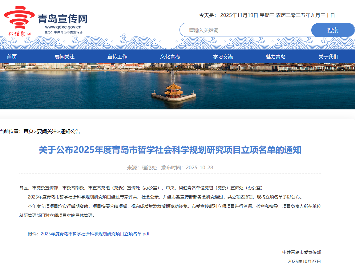 近日,中共青岛市委宣传部公布了2025年度青岛市哲学社会科学规划研究项目立项结果。我部青年教师王海燕博士申报的《体育地理视阈下体育赛事助力青岛城市发展的机制与路径研究》成功立项。