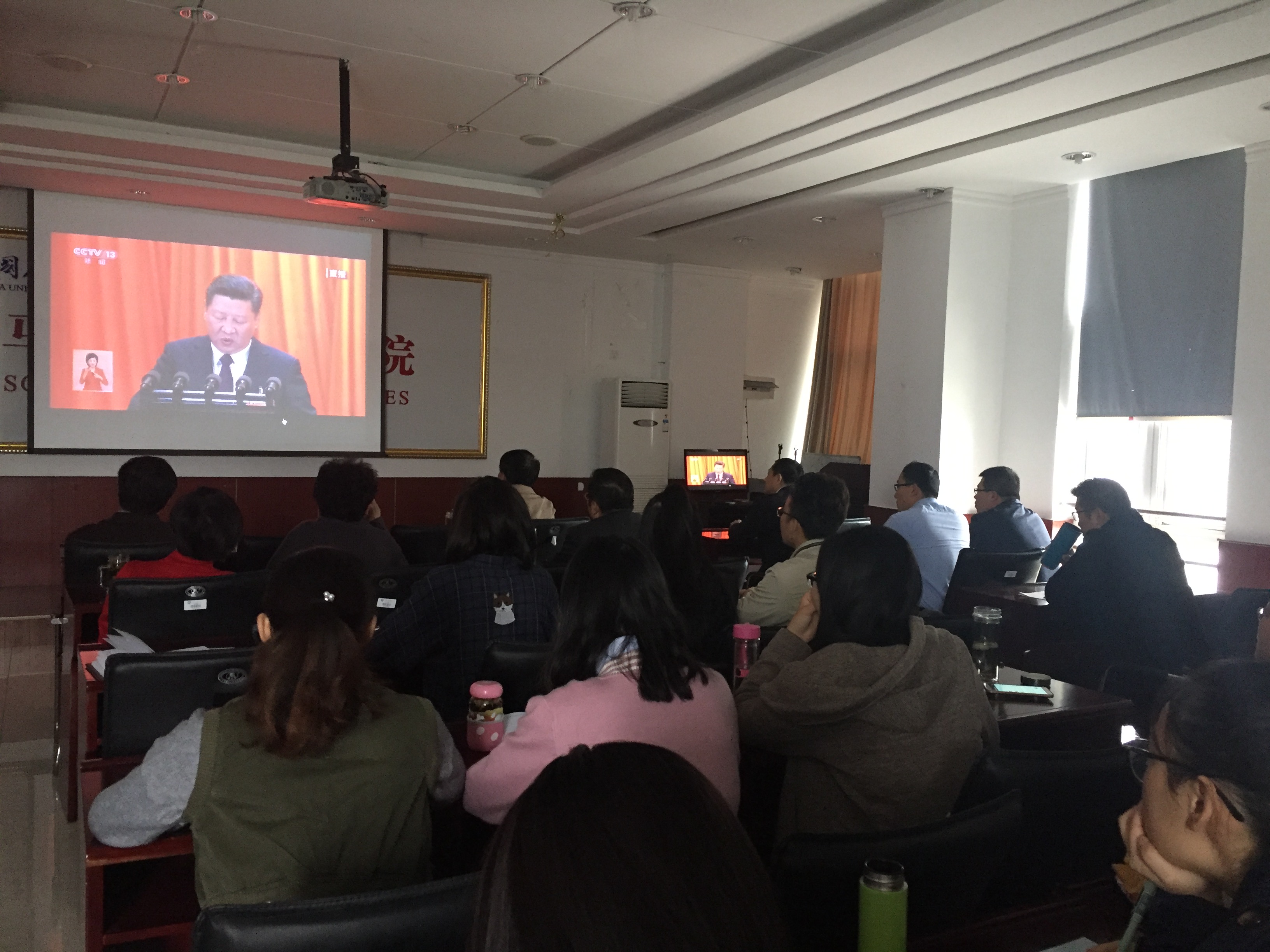 10月18日上午,马克思主义学院党委组织全院师生集体观看十九大开幕会。院长王建军、党委书记司江伟,无课教师、全体在校生参加会议。