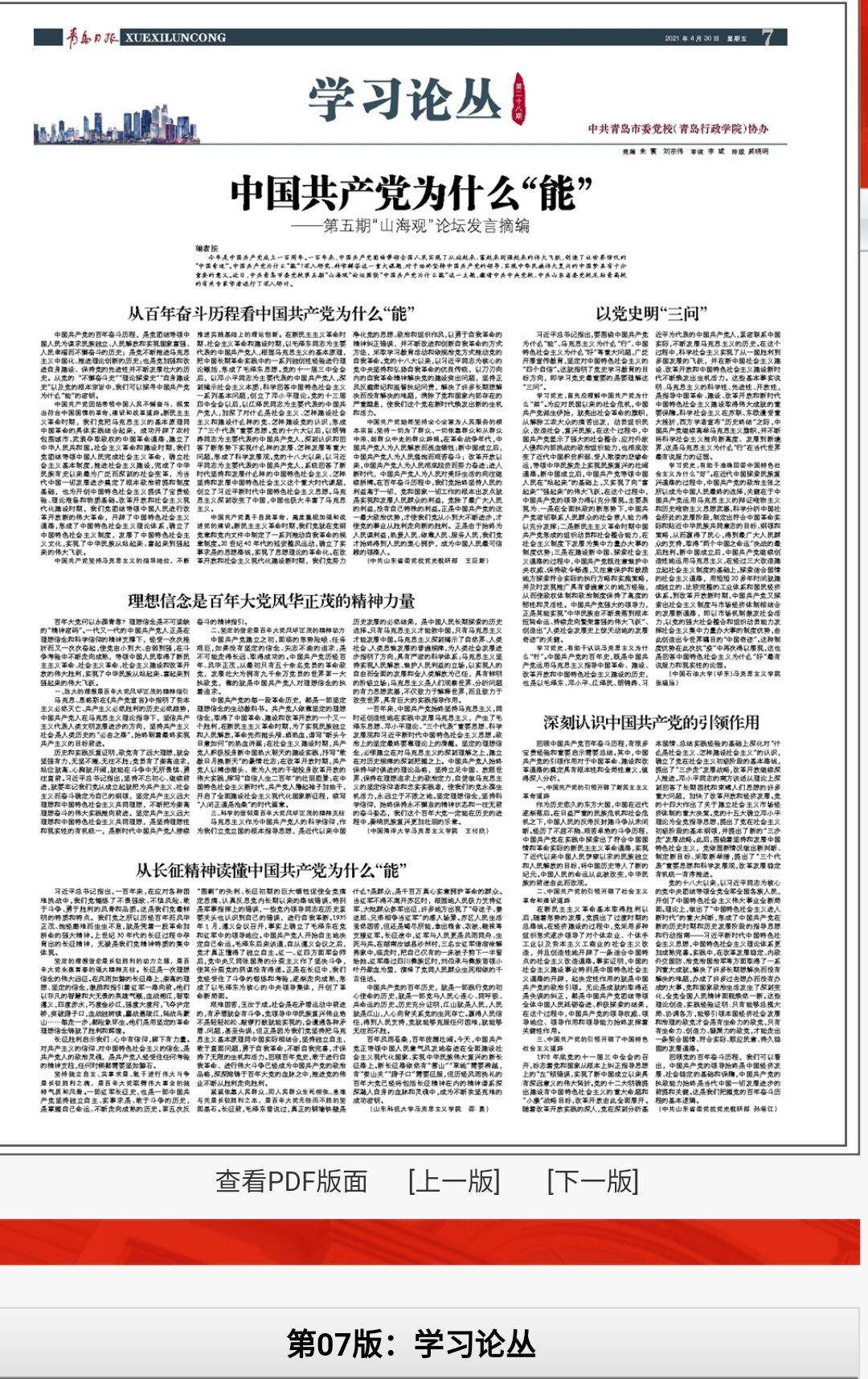 4月30日,《青岛日报》发表了我院张福运教授的理论文章《以党史明“三问”》。文章认为学习党史,首先应理解中国共产党为什么“能”,认识到中国共产党强大的国家能力,是其能实现“中华民族由不断衰落到根本扭转命运、持续走向繁荣富强的伟大飞跃”、创造出“人类社会发展史上惊天动地的发展奇迹”的关键。文章提出学习党史,有助于认识马克思主义为什么“行”,通过科学社会主义从理想变成现实,至今矢志不渝地遵循马克思主义的唯有中国共产党,而且在中国共产党领导的革命、建设和改革开放历程中,马克思主义得以丰富发展完善,所以马克思主义之所以“行”,关键在于中国共产党“能”。文章指出学习党史,有助于准确回答中国特色社会主义为什么“好”,尤其是以党的强大社会整合和组织动员能力发挥社会主义集中力量办大事的制度优势,创造出令世界瞩目的“中国奇迹”,而这种制度优势在此次抗“疫”中再次得以展现,这也是回答中国特色社会主义为什么“好”最有说服力和现实性的论据。
