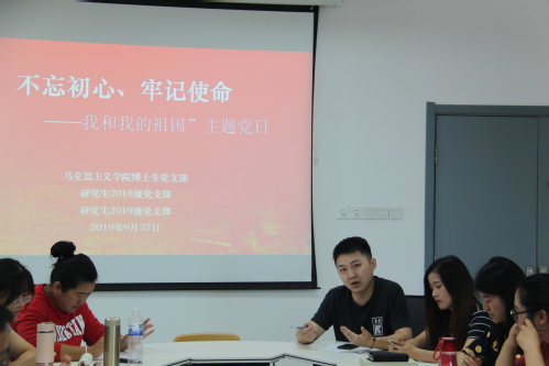 根据《马克思主义学院“不忘初心、牢记使命”主题教育工作方案》的相关要求,9月28日上午,我院博士生党支部、2018级研究生党支部、2019级研究生党支部等3个学生党支部的全体成员齐聚文理楼445会议室,联合开展了“我和我的祖国”主题党日活动,活动由博士生党支部书记邵鹏主持。