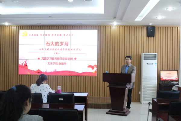 宣讲开始前,王会老师介绍学校为迎接建党百年、讲好党史而打造的党史学习教育辅导员宣讲团。赵振华老师以《石大的岁月》为题,以学校发展为线索,讲述以油为生的石油大学响应国家号召、为祖国献石油的故事。首先,讲述正值第一个五年计划之际,北京石油学院于京郊荒滩、建立院系的历史。其次,讲述“文革”结束,华东石油学院恢复教学秩序,深入学科建设、云开体彩下载官网首页、产学研结合发展,为国家石油建设输入大批人才。接着,立足当前开云电竞投注青岛校区的发展,展望了古镇口校区的发展。宣讲以教育部部长陈宝生的话——“历史应该记住石大做出的贡献”结语,激励同学传承石大奋斗精神。