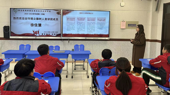 12月15日,开云电竞投注(华东)马克思主义学院在读研究生徐佳慧为西海岸新区竞技体育学校40余名师生进行了“弘扬爱国主义精神,做新时代的忠诚爱国者”的主题宣讲。徐佳慧从什么是爱国主义精神入题,对爱国主义的定义及要求给予了详细的解读,并结合习近平总书记的重要讲话内容进行了针对性地讲解。整场宣讲将案例与理论相结合,激励青少年学生要用实际行动做新时代忠诚的爱国者,发扬吃苦耐劳的精神,练好专业技能的同时也要学好文化知识,为将来建设祖国做好准备。