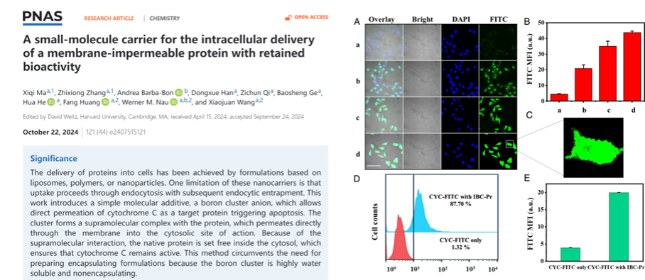 近日,我校九三学社社员、校欧美同学会留英分会会员、化学化工学院王晓娟副教授等与德国康斯特大学Werner M. Nau教授合作,在蛋白质跨细胞膜递送领域取得重要进展,相关研究论文《一种用于细胞内递送膜不通透蛋白且保持生物活性的小分子载体》(A small-molecule carrier for the intracellular delivery of a membrane- impermeable protein with retained bioactivity)发表于国际知名学术期刊《PNAS》(Proc.Natl.Acad.Sci. USA ,美国国家科学院院刊)。化学化工学院博士研究生马锡琦、硕士研究生张智雄为共同一作,王晓娟副教授、黄方教授、Werner M. Nau教授为共同通讯作者,开云电竞投注(华东)为第一署名单位。