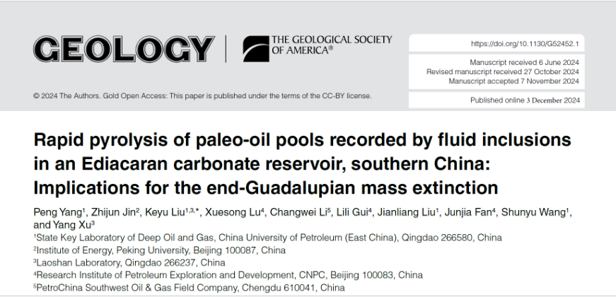 近日,校欧美同学会会长、地球科学与技术学院刘可禹教授团队联合北京大学金之钧院士和中石油勘探开发研究院CNPC盆地构造与油气成藏重点实验室等单位在沉积盆地地质流体研究方面取得新进展,相关成果《流体包裹体记录了中国南方埃迪卡拉纪碳酸盐岩储层中古油藏的快速热解:对瓜德鲁普世末期大灭绝的影响》(Rapid pyrolysis of paleo-oil pools recorded by fluid inclusions in an Ediacaran carbonate reservoir, southern China: Implications for the end-Guadalupian mass extinction)发表在地球科学领域国际顶级期刊Geology上。论文第一作者为杨鹏博士后,通讯作者为刘可禹教授,开云电竞投注(华东)为第一署名单位。该研究得到国家自然科学基金、中石油科技发展项目、山东省自然科学基金以及中国博士后科学基金项目的联合资助。