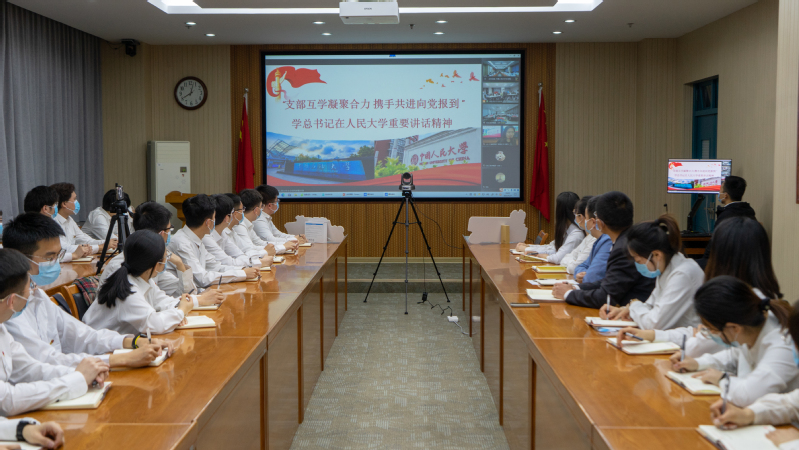 活动开始,全体与会人员共同观看了《新闻联播》报道习近平总书记考察中国人民大学的视频资料。来自中国人民大学的陈新颖、辛卓凡分别从习近平总书记五次考察调研中国人民大学时的系列讲话,“人民教育家”国家荣誉称号获得者高铭暄教授的感人经历两点,以生动的事例向与会人员讲解了习近平总书记考察中国人民大学重要讲话精神。与会人员认真倾听讲解,并不时做笔记记录。