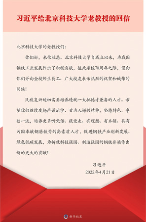 北京科技大学15位老教授给习近平总书记写信,汇报学校70年来的发展情况,表达了为我国钢铁产业高质量发展培养更多高素质人才的坚定决心。中共中央总书记、国家主席、中央军委主席习近平4月21日给北京科技大学的老教授回信,对培养更多高素质人才,促进钢铁产业创新发展、绿色低碳发展提出殷切期望。