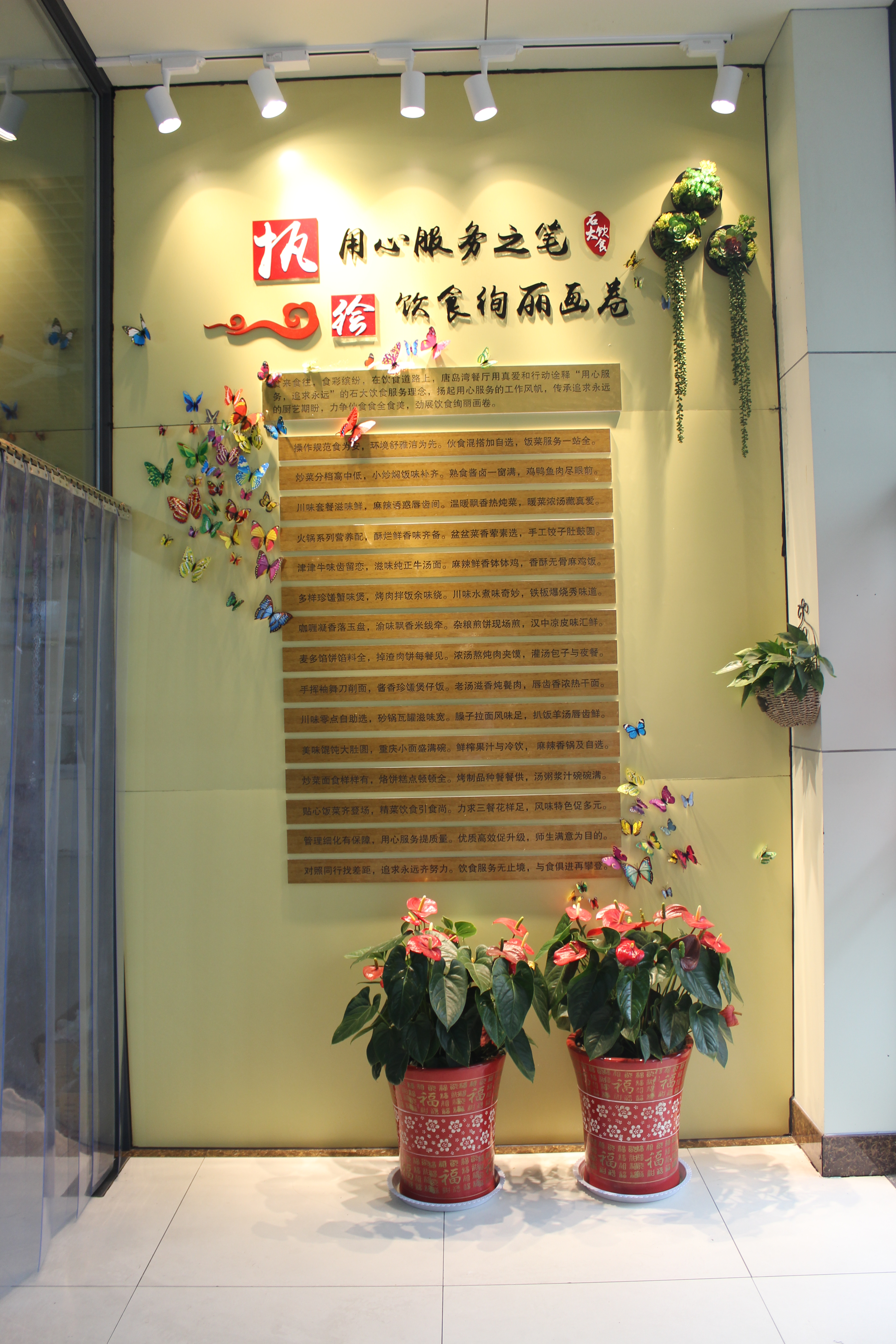 餐厅历来重视饮食文化的营造,餐厅东西入口、楼梯、墙面等增置了含有文化色彩的标语、图案,西门入口的十五行打油诗更是囊括了餐厅所有的美味佳肴。其特有的文化营造提升了餐厅的用餐环境,吸引着越来越多的师生来此就餐。
