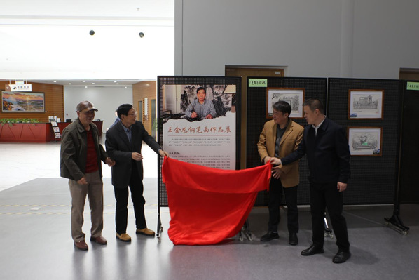 胡义贵代表学校接受捐赠,并向王金龙回赠捐赠证书。王金龙、郑其绪、李国、徐冰共同为作品揭幕。