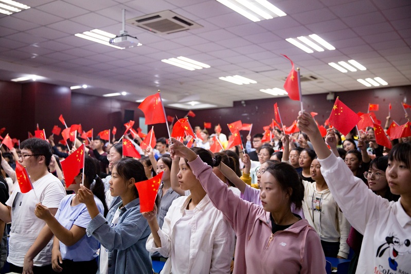 学院党委副书记邹维忠脸贴红旗图案,手持小红旗与学生们一起观看阅兵。在看到许多学生自发穿着红色衣服且拿着国旗时,邹维忠对此表示欣慰,他说:“从大家的这些细微的行为中,我们可以看出来我们文学院学生所具有的爱国意识。”他希望学生们能通过大学的学习和生活培养自己正确的世界观、人生观和价值观,以所学回馈社会和国家,将爱国情怀融入到实践过程中去。
