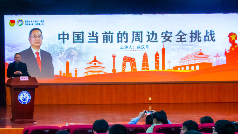成汉平教授从“我国的周边安全环境日益复杂”讲起,提到了疫情期间我国所面临的外部挑战。他以“守成大国与崛起大国结构性矛盾”来解释中美之间的冲突,进一步延伸说明我国正面临着部分西方国家与周边国家的挑衅,以及我国面对挑衅毫不退让的坚定决心。
