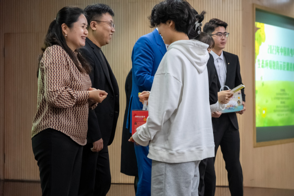 活动最后,生态环境部宣传教育中心史国鹏、山东省生态环境保护宣传教育中心薛梅、冈特先生、凯瑟琳娜女士现场为学生代表赠送书籍。