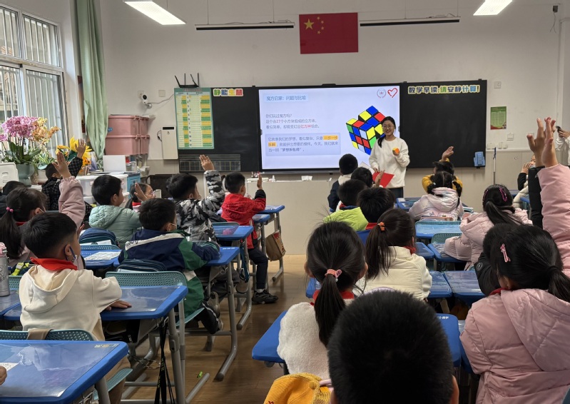 第二环节中,王辰鑫以“魔方少年”为主题,通过演示文稿科普城市管道系统的功能,以“魔方精准拼接”类比“管道规范铺设”,讲解供水、燃气管道的输送原理及安全保护要点。随后的互动环节,王辰鑫设置管道知识问答,向答对的学生分发迷你管道模型;同时邀请一名学生现场打乱三阶魔方,王钰现场完成复原演示,以直观形式呼应“管道维护需专注细致”的核心提示,现场响起热烈掌声。