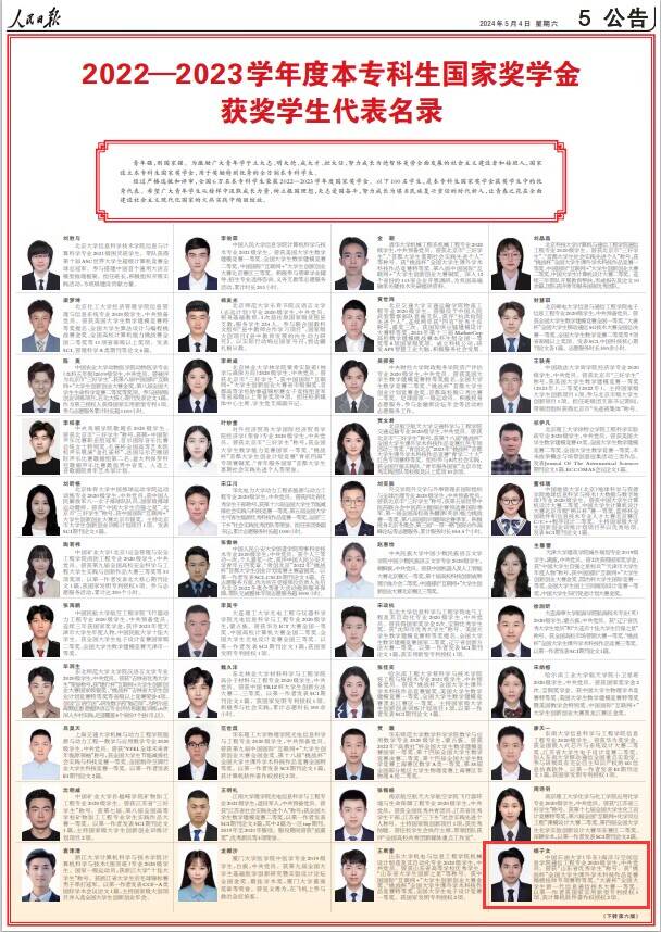5月4日、5日,《人民日报》第5-6版、第6-7版分别整版刊登2022—2023学年度《本专科生国家奖学金获奖学生代表名录》《研究生国家奖学金获奖学生代表名录》,我校2020级通信工程专业本科生杨子文、2021级油气储运工程专业硕士研究生韩晨玉名列其中,本次是我校本科生和研究生首次同时入选。