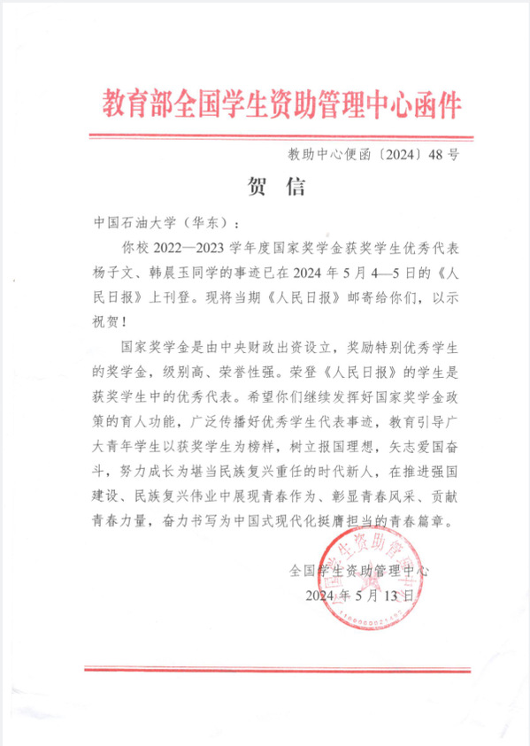 日前,我校收到教育部全国学生资助管理中心发来的贺信,对我校国奖获奖学生杨子文、韩晨玉同学的先进事迹在《人民日报》刊登表示祝贺。 国家奖学金是由中央财政出资设立,奖励特别优秀学生的奖学金,级别高,荣誉性强。荣登《人民日报》的学生是获奖学生的优秀代表。希望广大学子能够以获奖学生为榜样,树立报国理想,矢志爱国奋斗,努力成长为堪当民族复兴重任的时代新人,在推进强国建设、民族复兴伟业中展现青春作为、彰显青春风采、贡献青春力量,奋力书写为中国式现代化挺膺担当的青春篇章。