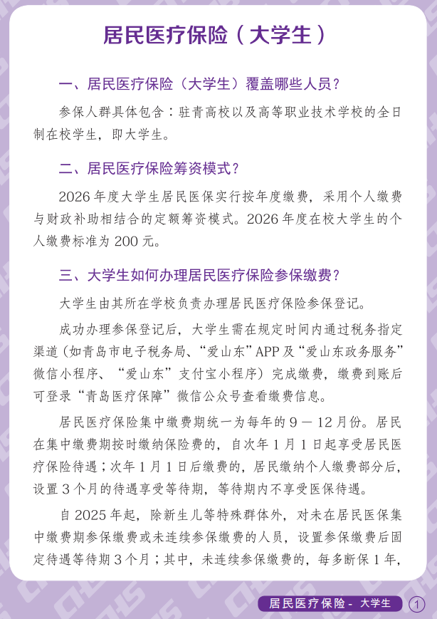⭐更多征缴、待遇享受政策详情,请见附件《青岛市医疗保障局——居民医疗保险(大学生)》。如遇政策调整,请以新政策为准,不再通知。